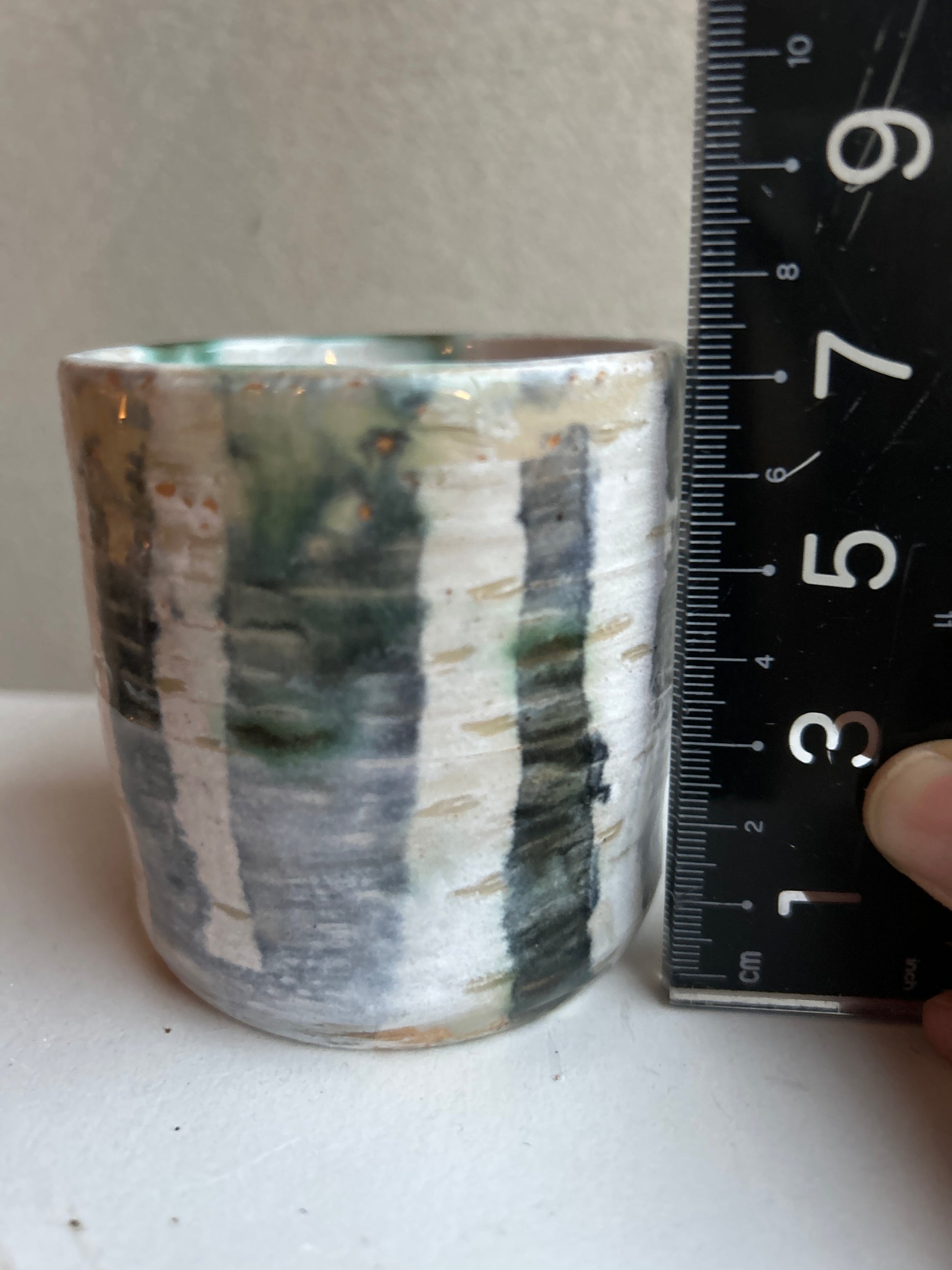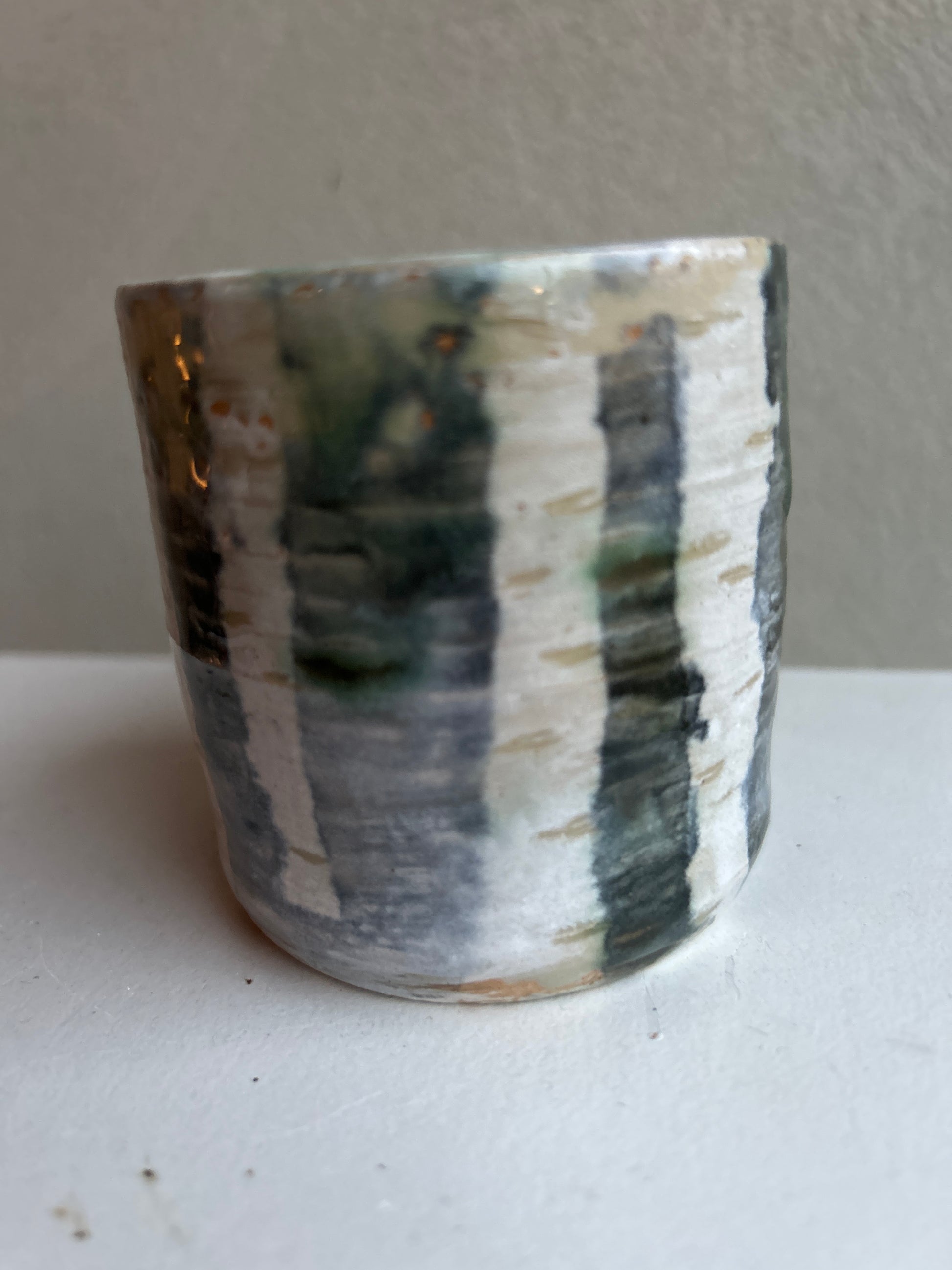 Deze beker is gedecoreerd met een donker bos met witte berken stammen